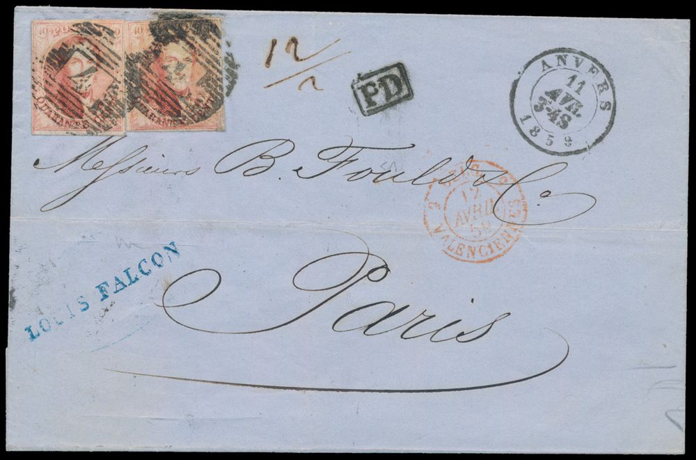 1481 image1859 N° 12A "20c. vermilion", 2 fully margined items on letter without content, cancel P.4-Anvers, departure stamp Dcb (21 f), dated 11 April 1859, to Paris (France), "PD" in black box, nice manuscript "12/2", double charge abroad France, vf (COBA ++€210)(Image 1) (Image 2)