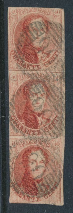 1487 0 imageN° 12 "40c. vermilion", upright strip of 3 stamps, not fully margined, cancel P.90-Ostend, f/to be checked (OBP €650)(Image 1)