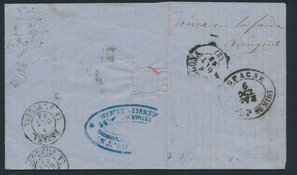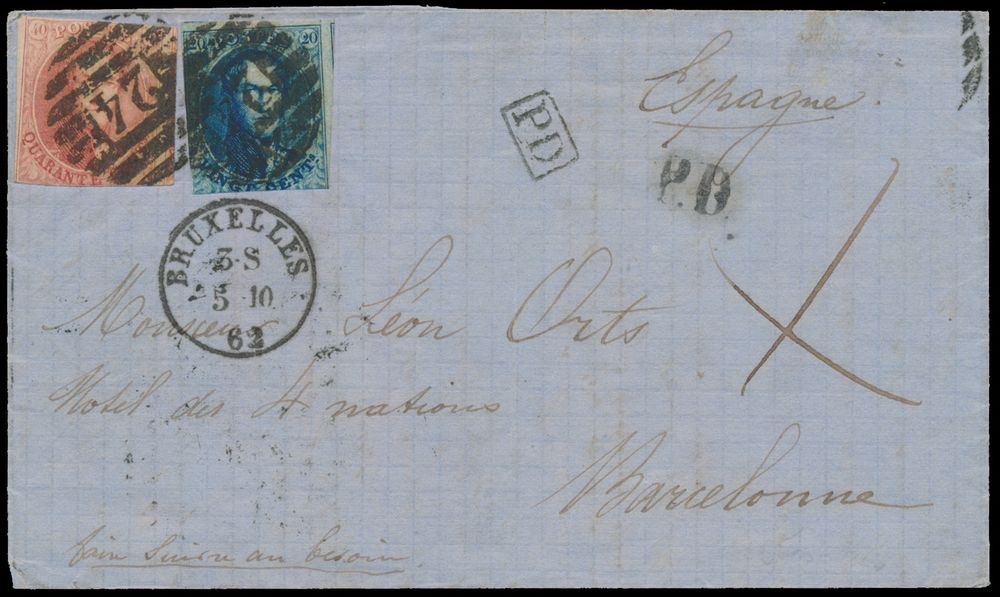 1485 image1862 N° 11 and 12, on letter with contents, from P.24-Bruxelles (8 bars), dated 5 October 62, to Barcelona (Spain), two different "PD" cancellations, one black in box, second black without box, nice manuscript "faire suivre au besoin" (Besançon), vf/f(Image 1) (Image 2)