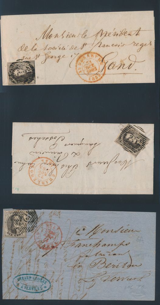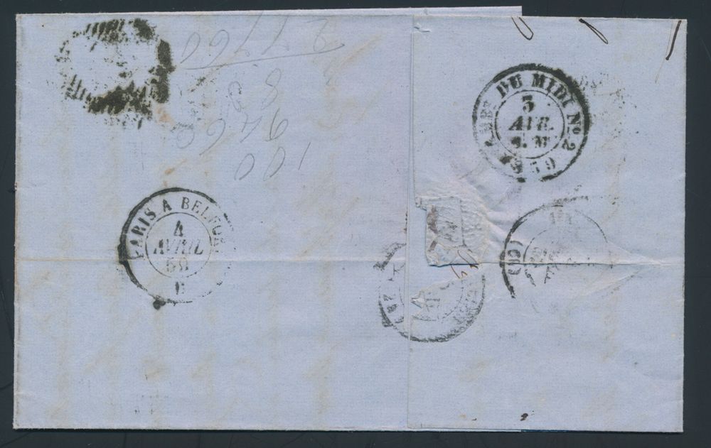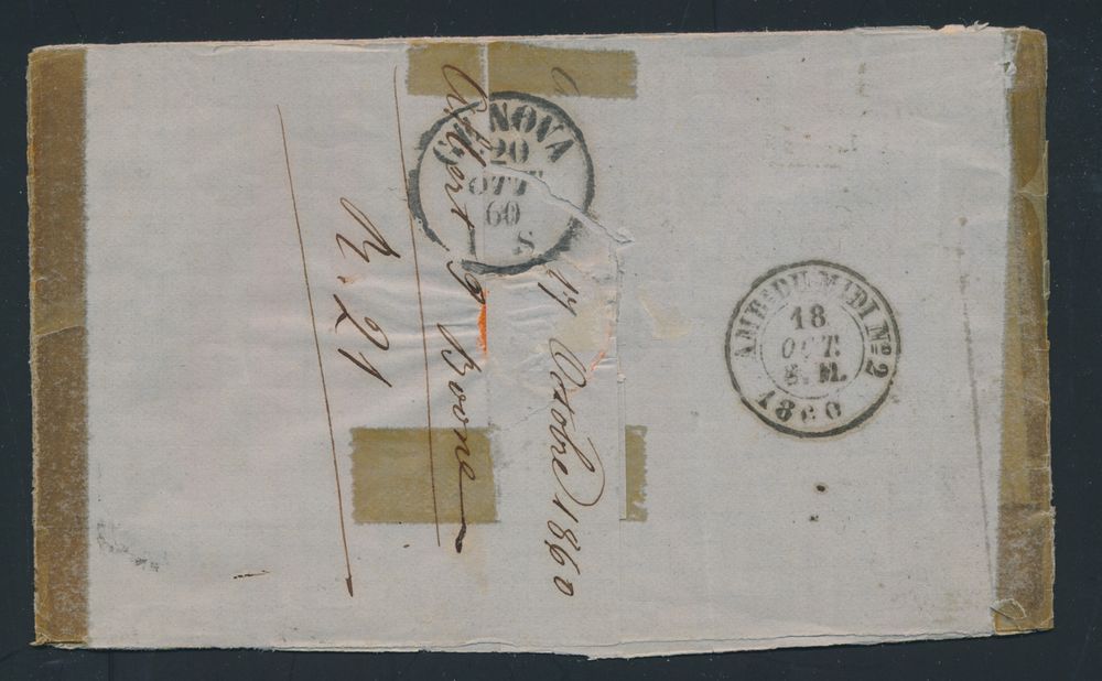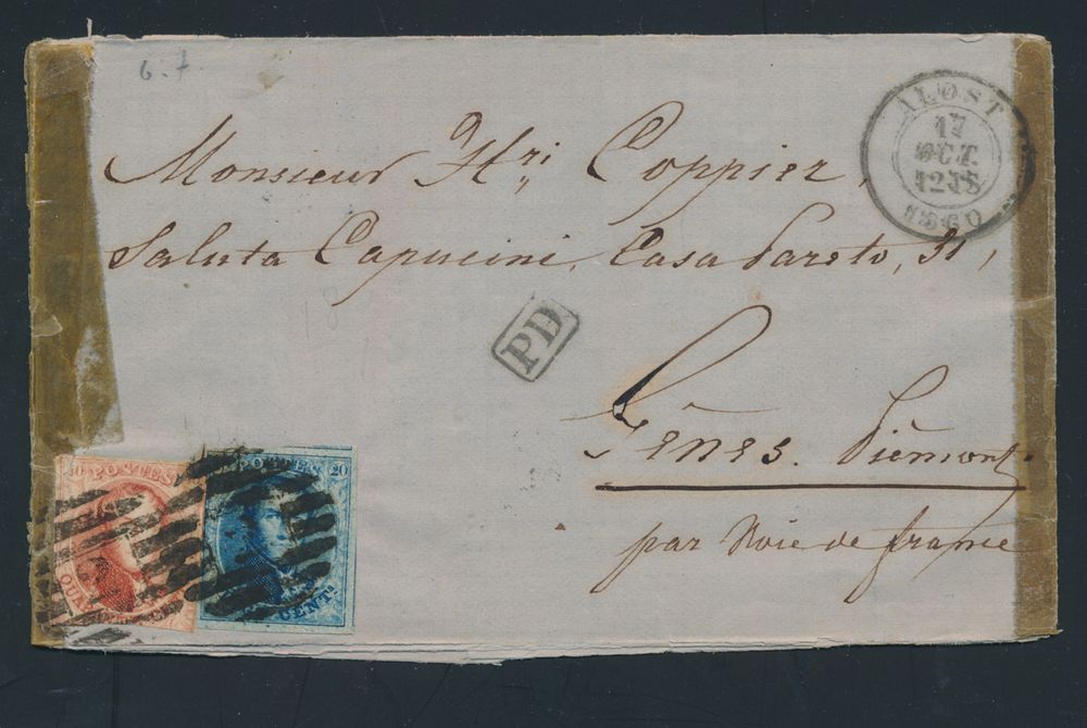 1483 image1860 N° 11A fully margined with neigbours, 12A corner torn and cut, on letter with contents, from P.2-Alost (8 bars), dated 17 October 1860, to Genoa Piedmont (Italy), manuscript "par voie de France", "PD" in black frame and black stamp "Ambt du Midi N° 2", letter has suffered damage, f/to be checked(Image 1) (Image 2)