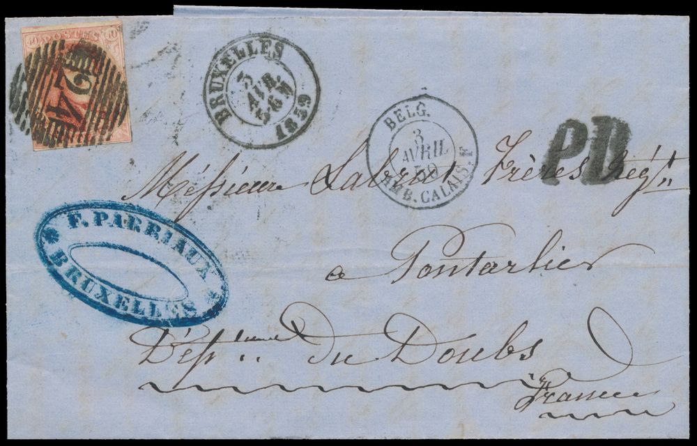 1482 image1859 N° 12A "40c. vermilion", fully margined on letter, cancel P.24-Bruxelles, dated 3 April 59, to Pontarlier (France), "PD" in black italics, vf (OBP €210)(Image 1) (Image 2)