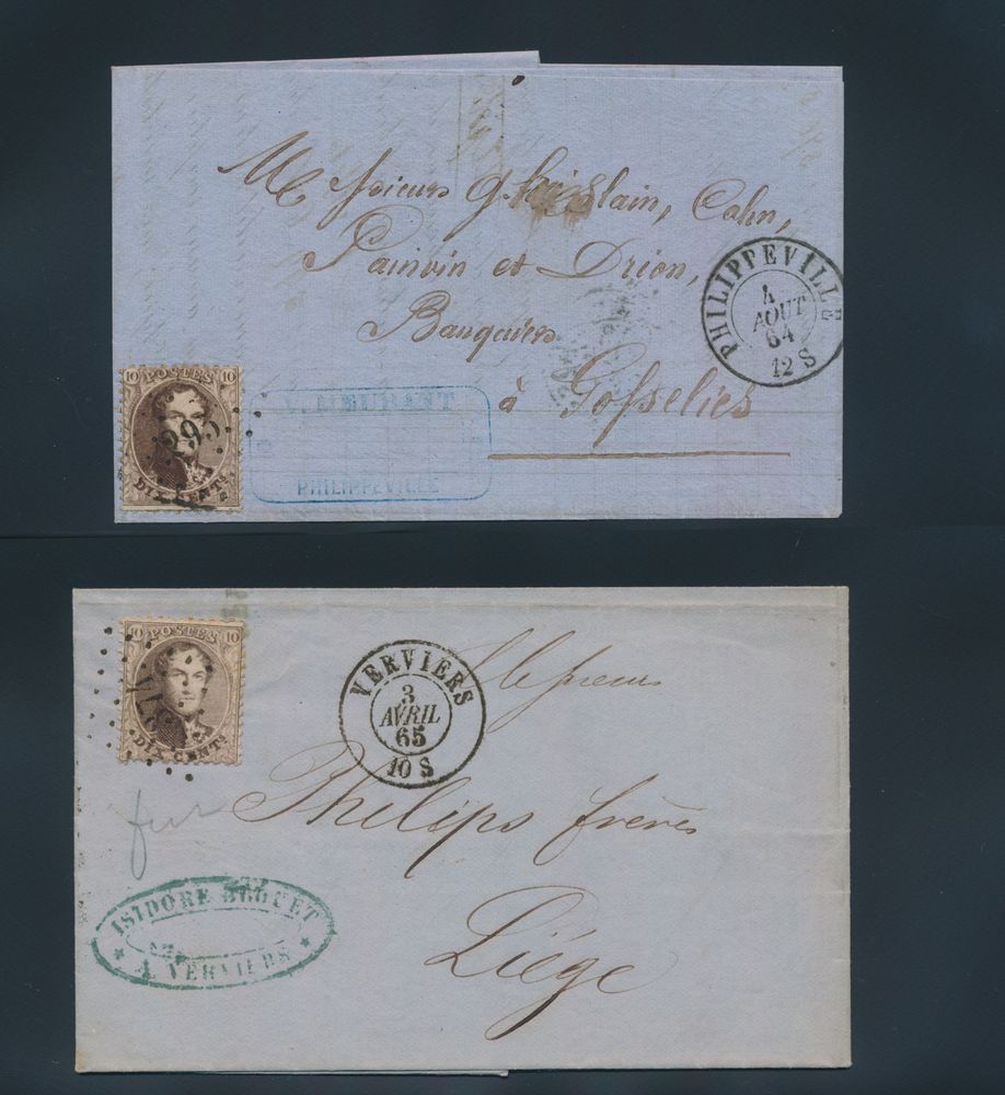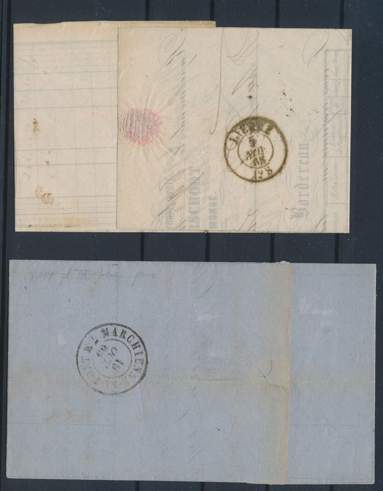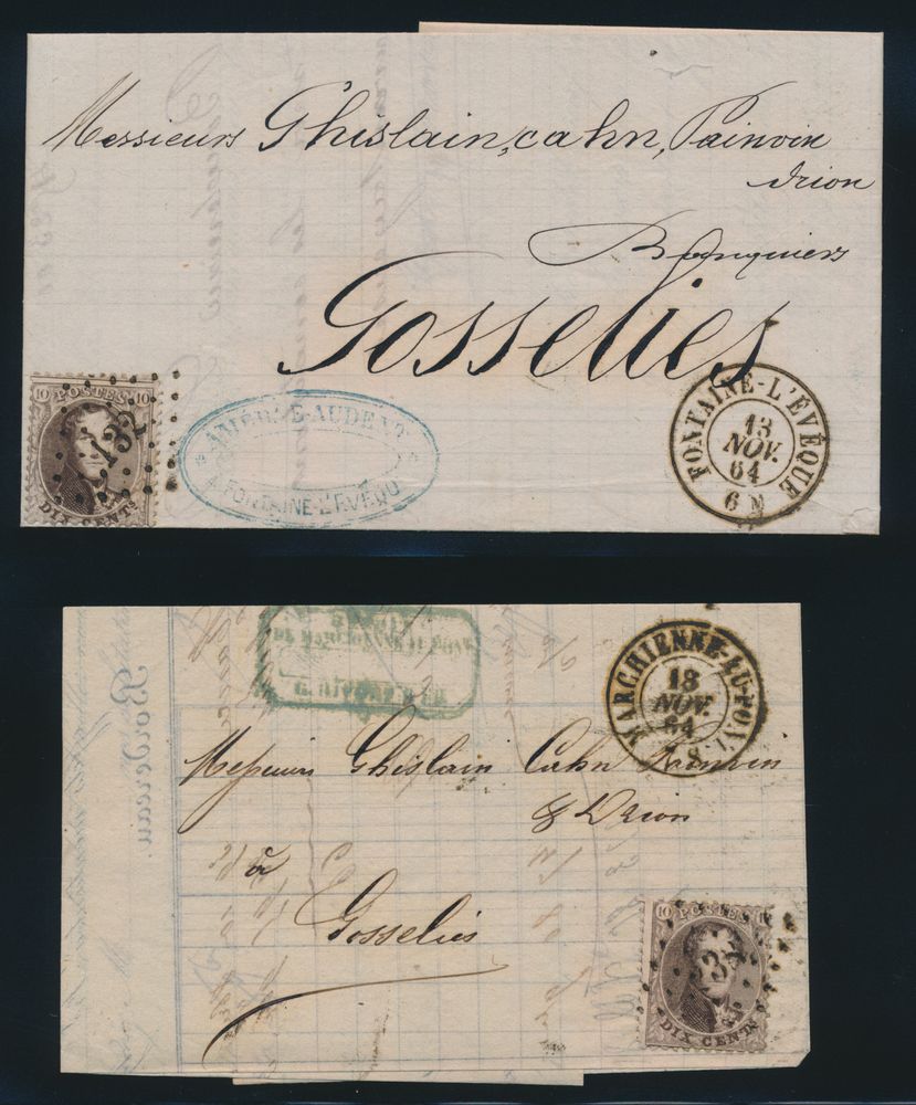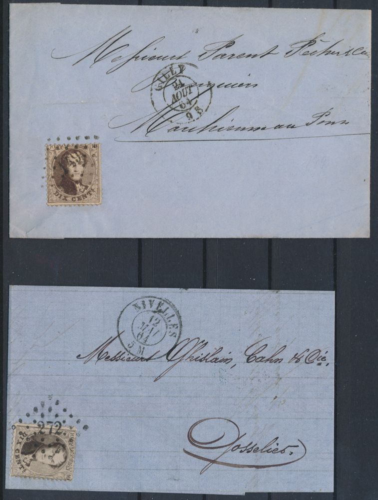 1514 imageN° 14 "10c. brown" (2x) on letter, all plate II, with cancel Pt. 149-Gilly and Pt. 272-Nivelles, vf(Image 1) (Image 2)