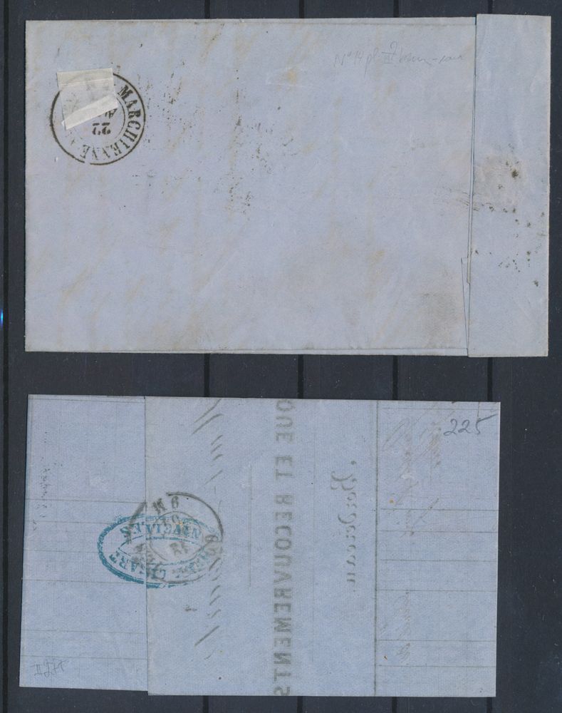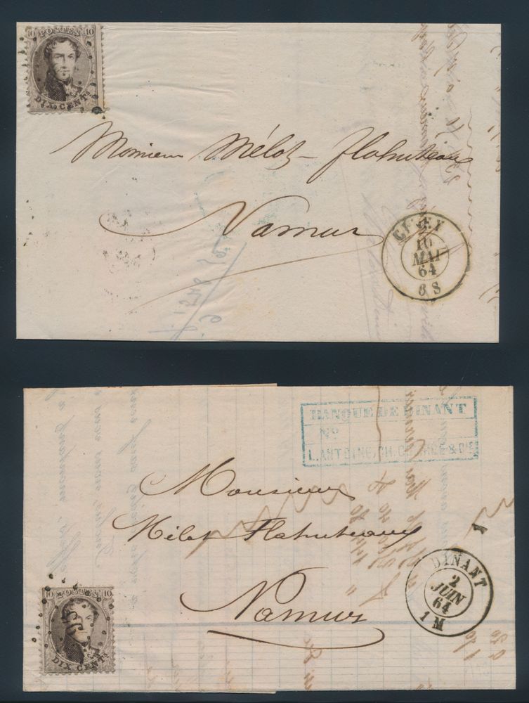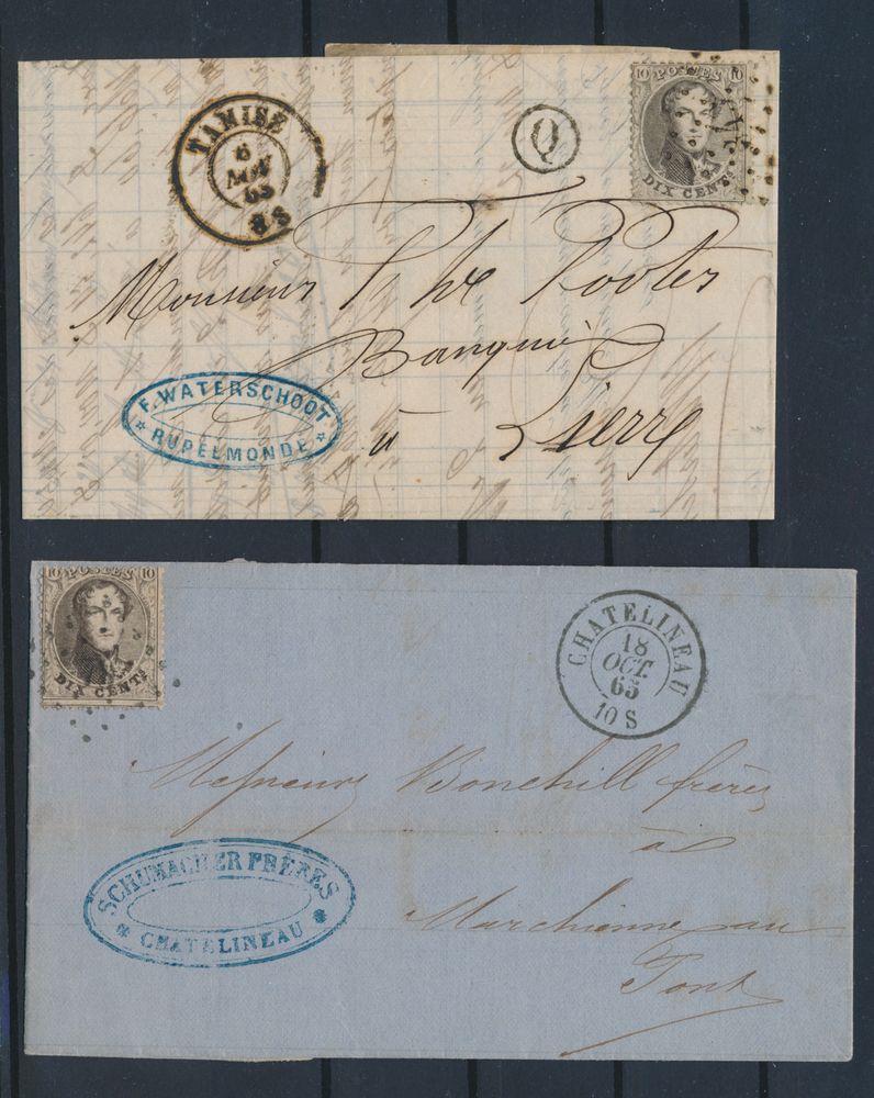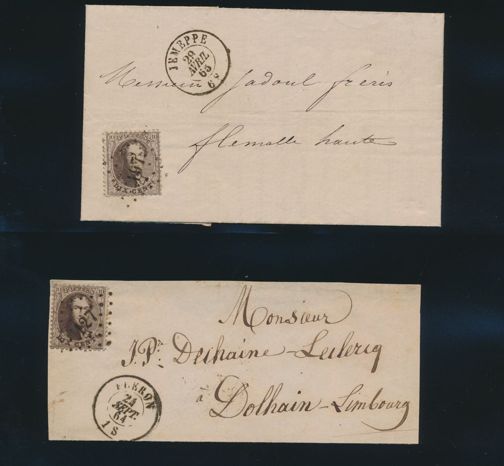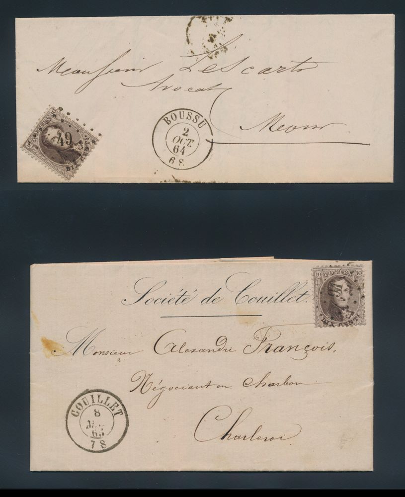 1514 imageN° 14 "10c. brown" (2x) on letter, all plate II, with cancel Pt. 149-Gilly and Pt. 272-Nivelles, vf(Image 1) (Image 2)