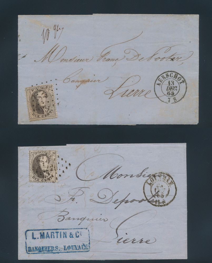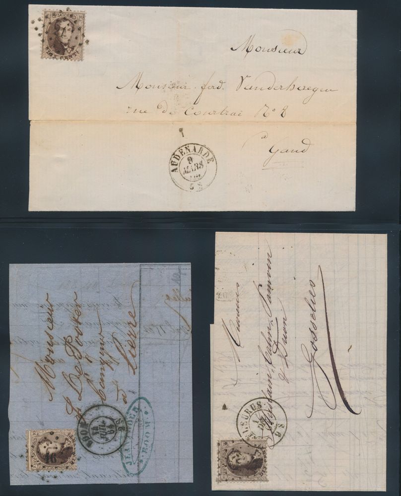 1518 imageN° 14B "10c. brown" (4x) on letter (1 horizontal and 1 vertical pair), all plate III, with cancel Pt. 2-Aerschot, Pt. 226-Louvain, Pt. 310-Renaix (pair) and Pt. 351-Termonde (pair), vf(Image 1) (Image 2)