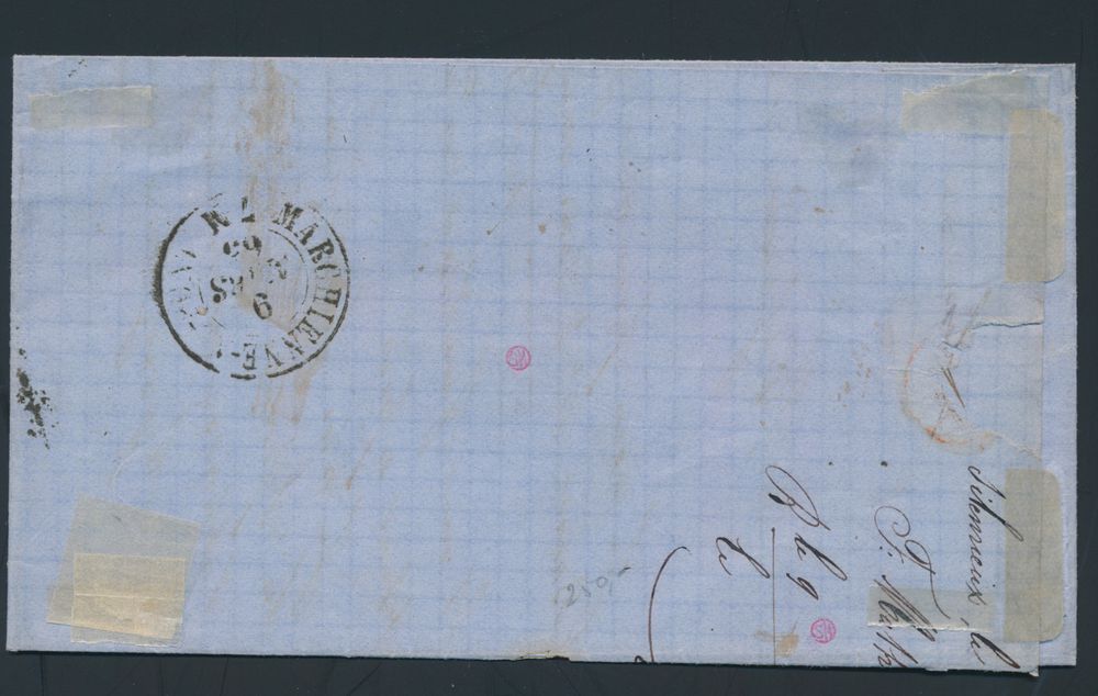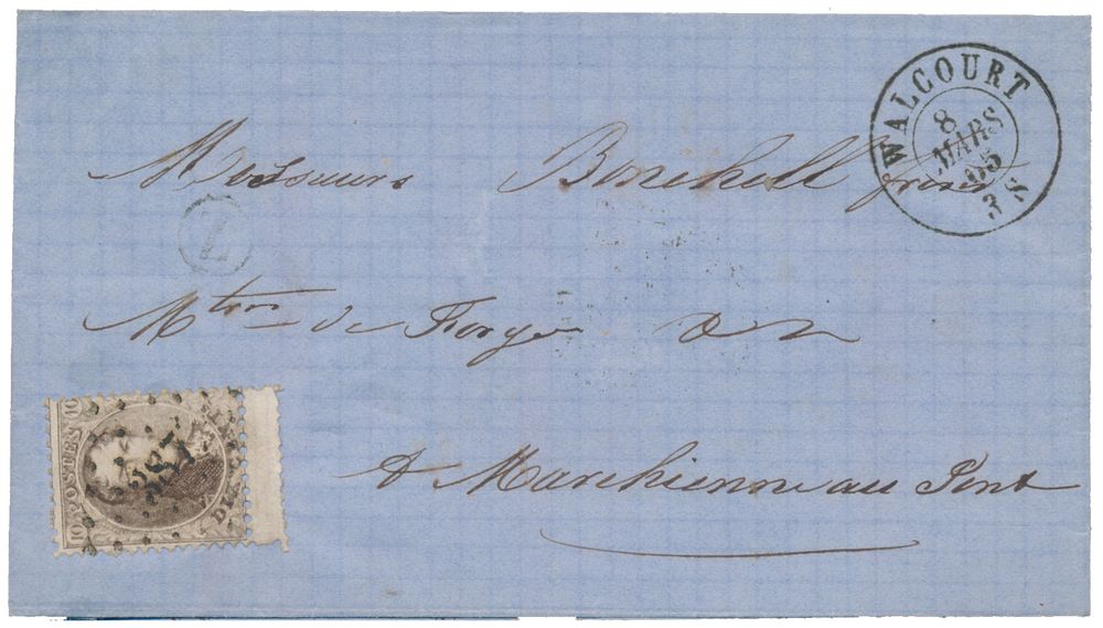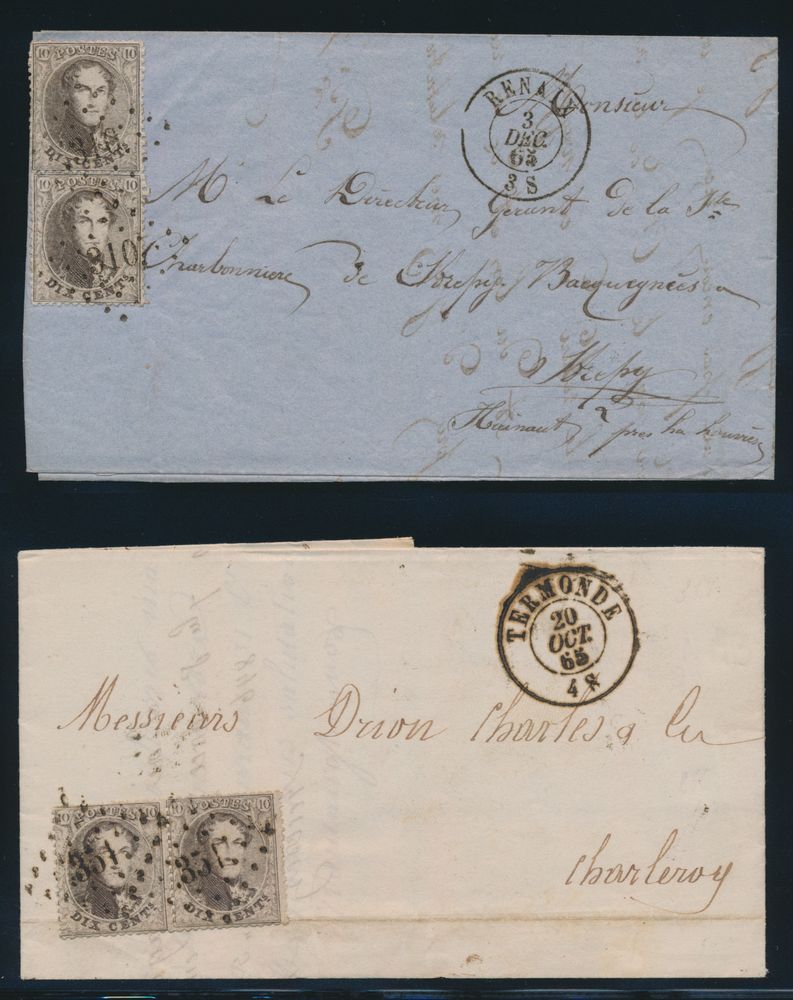 1520 image1865 N° 14A, "10c. brown", on letter with contents, cancel Pt.387-Walcourt, dated 8 March 65, to Marchienne-au-Pont, with BEAUTIFUL INTERMEDIATE PANEL at the bottom, beautiful, vf(Image 1) (Image 2)