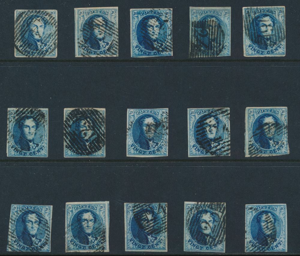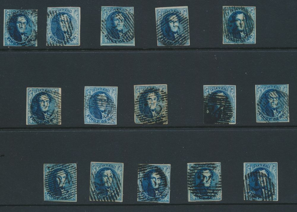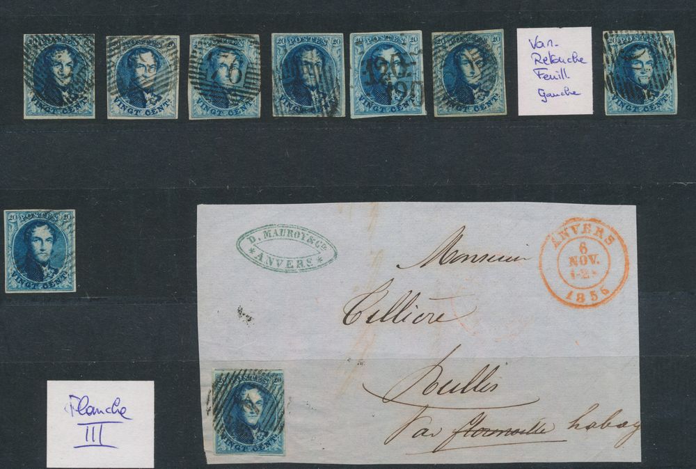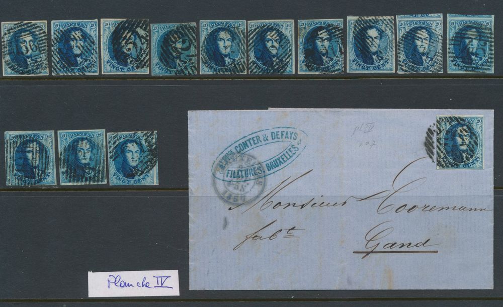 1507 0 imageN° 7 "20c. blue", plate IV, 13 stamps and 1 letter, all plate, almost all very nicely margined, nuances, varieties, see scan, vf(Image 1)