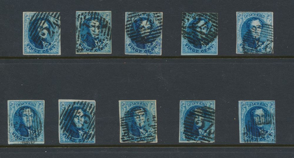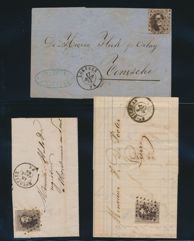 1517 imageN° 14A "10c. brown" (5x) on letter, all plate II, with cancel Pt. 83-Ciney, Pt. 96-Dinant, Pt. 222-Lokeren, Pt. 258-Moustier and Pt. 328-Saint Nicolas, vf(Image 1) (Image 2)