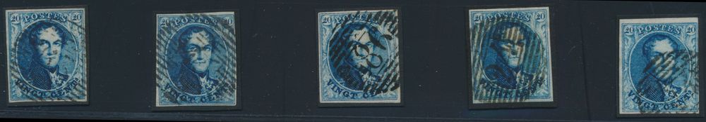 1564 0 imageN° 4 "20c. blue" (5x), all fully margined with wide margins, on parchment paper with colour nuances, also nice plating material, vf(Image 1)
