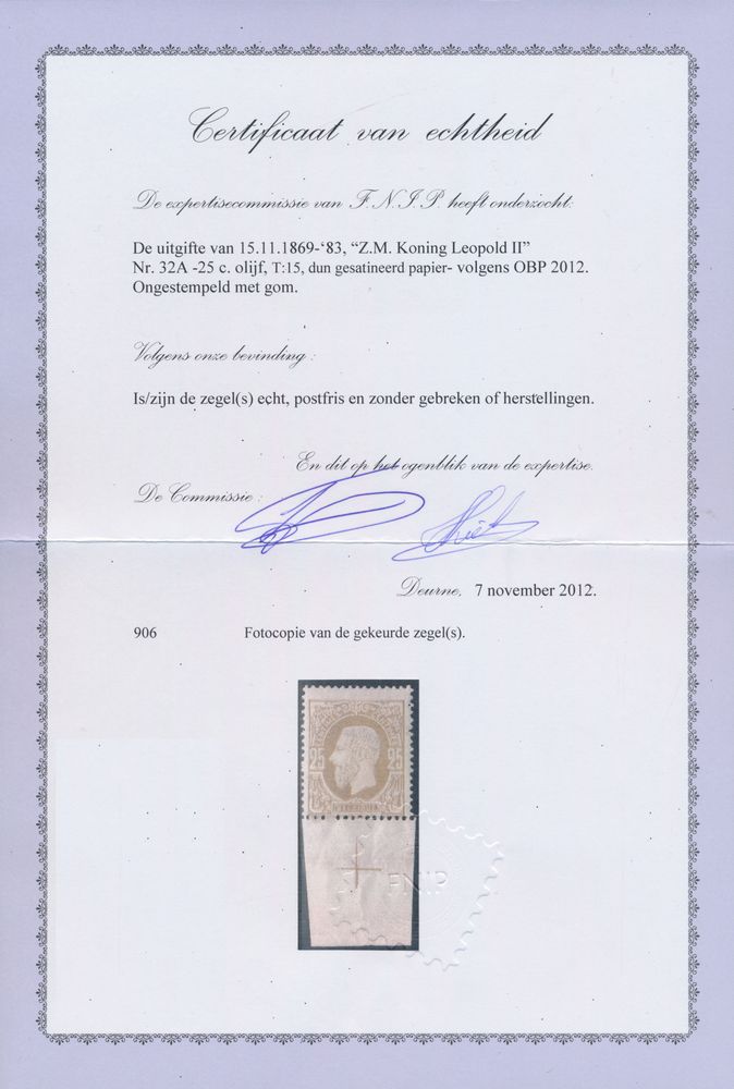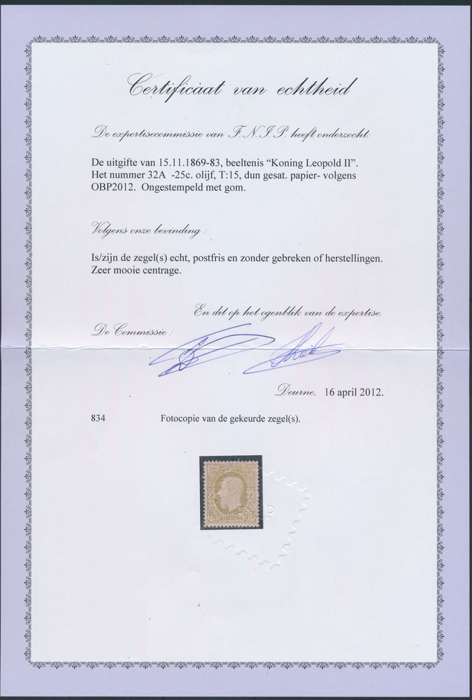 1636 nh imageN° 32A "25c. olive" in very nice centring and photo certificate FNIP dated 06.04.2012, luxurious!, vf (OBP €570 + 150% = €1,425)(Image 1) (Image 2)