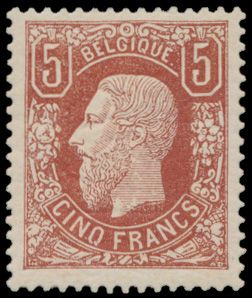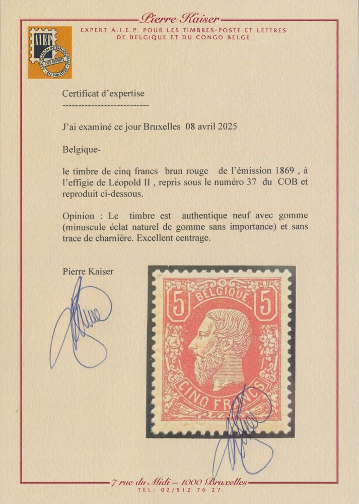 1640 nh imageN° 37 "5fr. brown-red", very fresh and with very good centring with photo certificate (Kaiser) with insignificant original spot on gum, mentioned on certificate, vf (OBP +150% €12,500) - see photo cover(Image 1) (Image 2)
