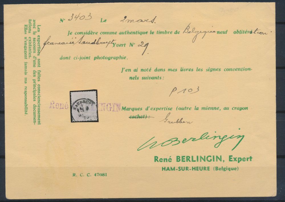 1642 0 imageN° 29 "8c. violet", with French cancel "Saudrupt", with Berlingin certificate, vf(Image 1) (Image 2)