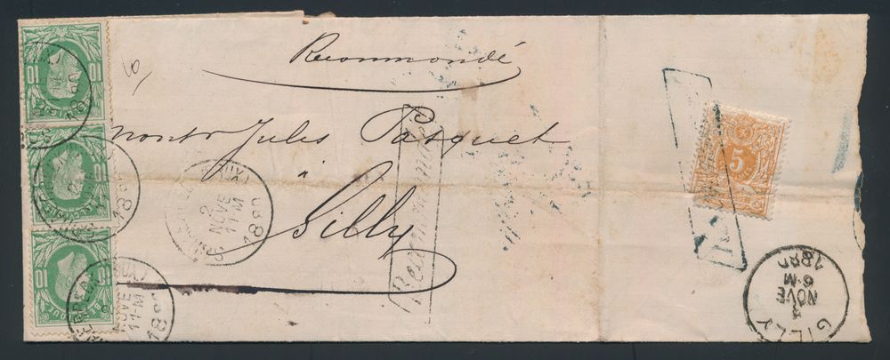 1655 image1880 N° 30 "10c. green" (3x) and 28 on registered letter, from Schaerbeek (Brux.), dated 2 November 1880, to Gilly, 2x stamped parallelogram "Recommande" on front and back and manuscript "Recommandé", charge 10 cents and 25 cents registration fee, n° 28 is not cancelled by a departure stamp but by a "Recommande" stamp, vf(Image 1) (Image 2)