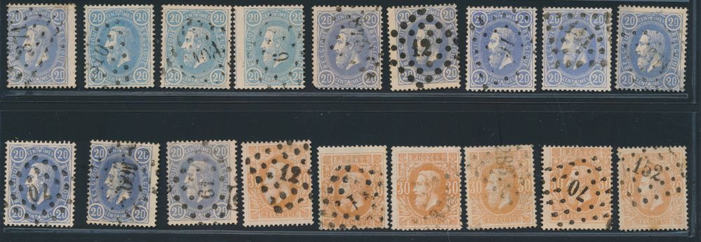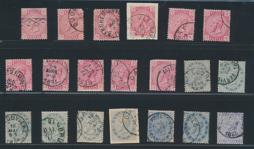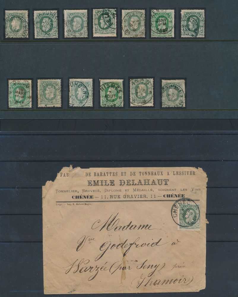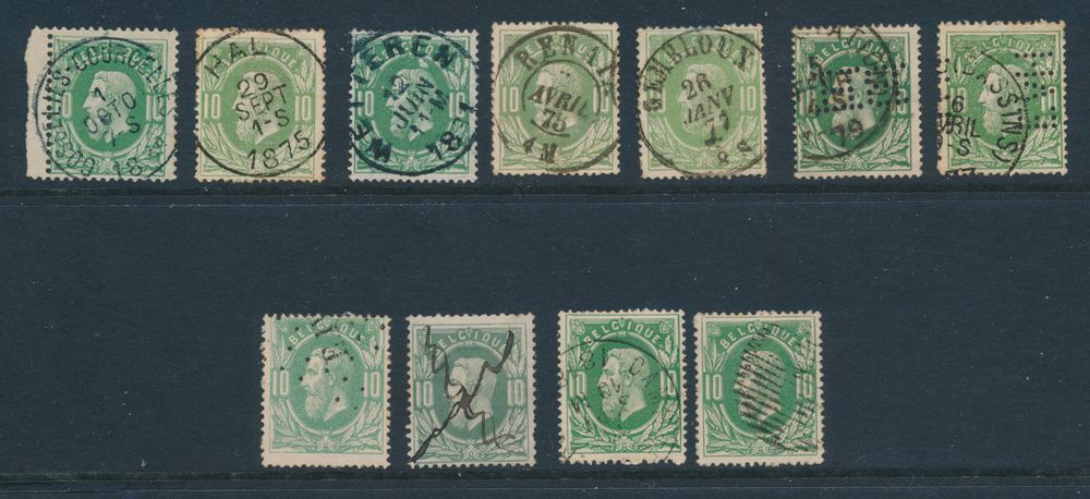 1645 0 imageN° 30 "10c. green" (14x), better cancellations on stamps of varied condition, Beirvelde (Destelbergen) (2x), Cruybeke, Diepenbeek, Feluy, Haesdonck, Kammel, Noville-lez-Bastogne, Pecq, Saffelaere, Tohogne, Nismes, Asch, Seny (on letter), f/to be checked(Image 1)