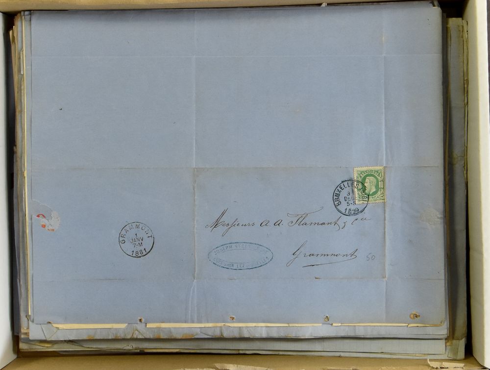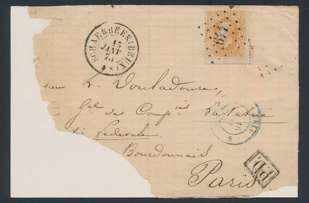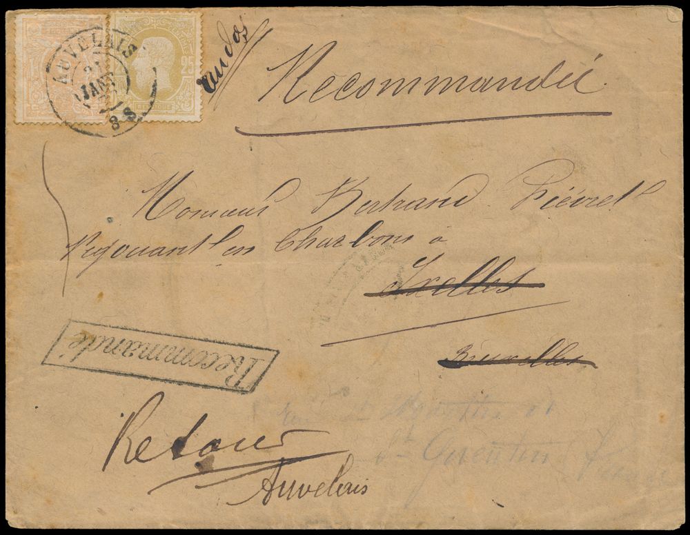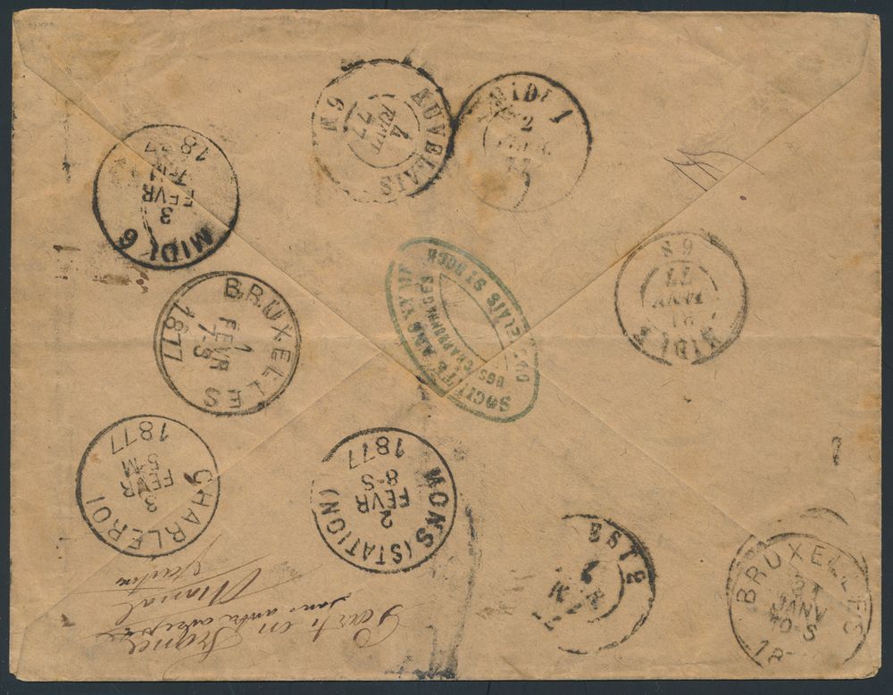1654 image1877 N° 24 and 32, on registered letter envelope, from Auvelais, dated 31 January 1877, to Ixelles, with return shipment, 9 cancellations (!) on the reverse, including 4 ambulantory (EC MIDI ? on 31/1, Dca EST 2 on 1/2, Dca MIDI 1 on 2/2 and EC MIDI 6 on 3/2), with Dca (Auvelais) and 3 EC Mons (Station) on 2/2, Charleroi on 3/2 and Bruxelels on 31/1 and 1/2), on the reverse side manuscript "Parti en France sans autre adress .... parti", "Recommandé" as manuscript and in parallelogram black, stamps are irregularly cancelled, 1 cancellation on two stamps, unique with so many different cancellations (including train), vf(Image 1) (Image 2)