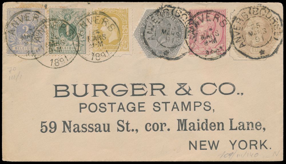 1657 image1891 N° 26, 27, 32, 46, TG 1 and TG 3, on letter, the first 4 stamps cancelled on 24 March 1891 with postmark (T0 - Anvers), and the telegraph stamps on 25 March 1891 (cancelled with telegraph postmark - Anvers(Bourse), to New York (USA), no trace of receipt marks, this combination of stamps is very unusual, vf (TG 1 on letter has OBP of 210 euros)(Image 1) (Image 2)
