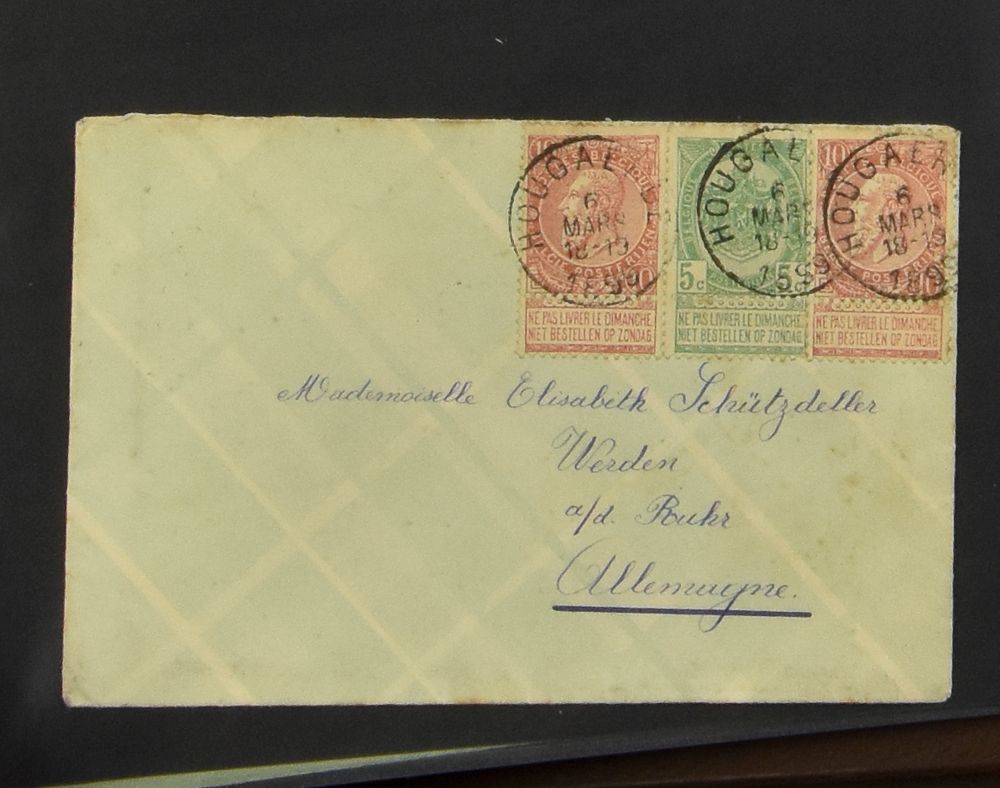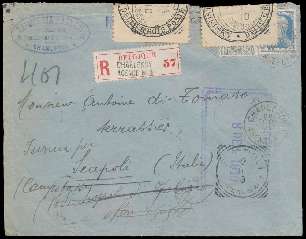 1718 image1910 N° 76 "20c. blue" and 63 "50c. grey", on registered letter "Charleroy Agence N° 3",dated 28 Oct 1910, to Scapoli (Campobasso-Italy), letter was resent, dated 8 Dec 1910 (cancelled in blue-purple frame), vf(Image 1) (Image 2)