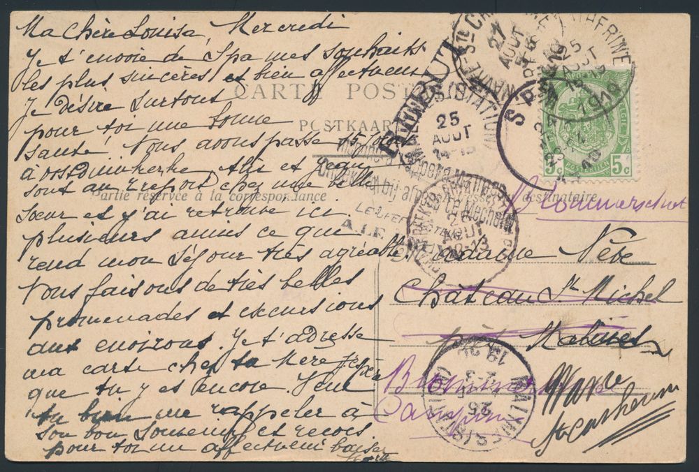 1720 ZK image1910 N° 83 "5c. green" on picture postcard, from Spa, dated 24 August 1910, to Malines, several cancellations present, such as Malines (Station), Schaerbeek and Wavre-St.-Catherina, nice cancellation of "Rebut" in black, vf(Image 1) (Image 2)