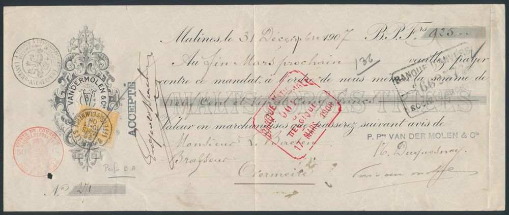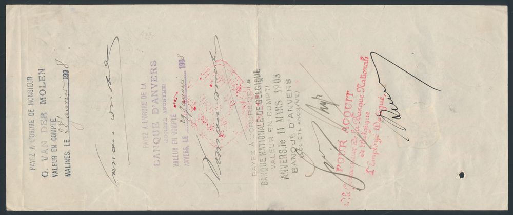1714 0 imageN° 79 "1fr. orange-yellow", on bank document, cancelled "Bruxelles Effets de commerce", small "DE", several bank stamps (banque Nationale and banque D'Anvers), vf (OBP €250)(Image 1) (Image 2)