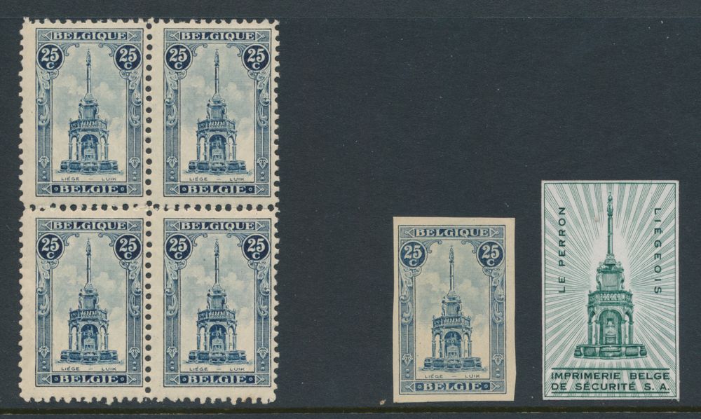 1804 nh imageN° 164 "25c. blue" in block of four.+ imperforate + vignette "Le Perron Liègois, Imprimerie Belge de Sécurité S.A.", vf (OBP +€190)(Image 1)