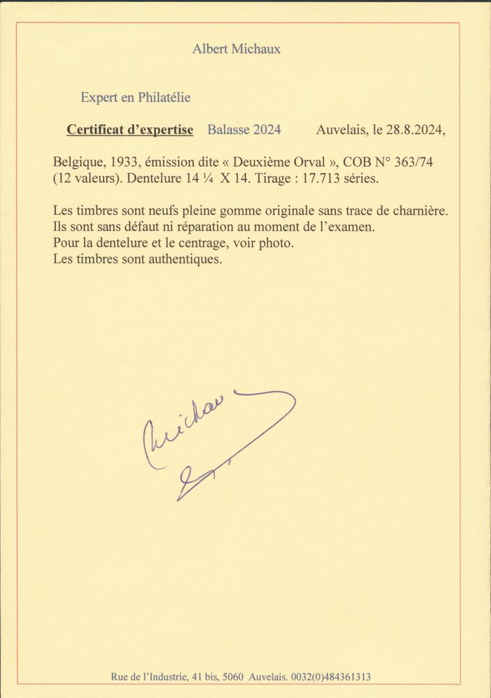 1873 nh imageN° 363/74 "Complete set" with Balasse photo certificate dated 28-08-24, vf (OBP €3,100)(Image 1) (Image 2) (Image 3)