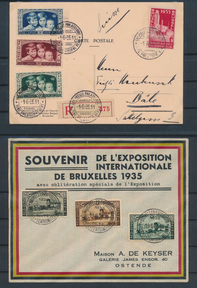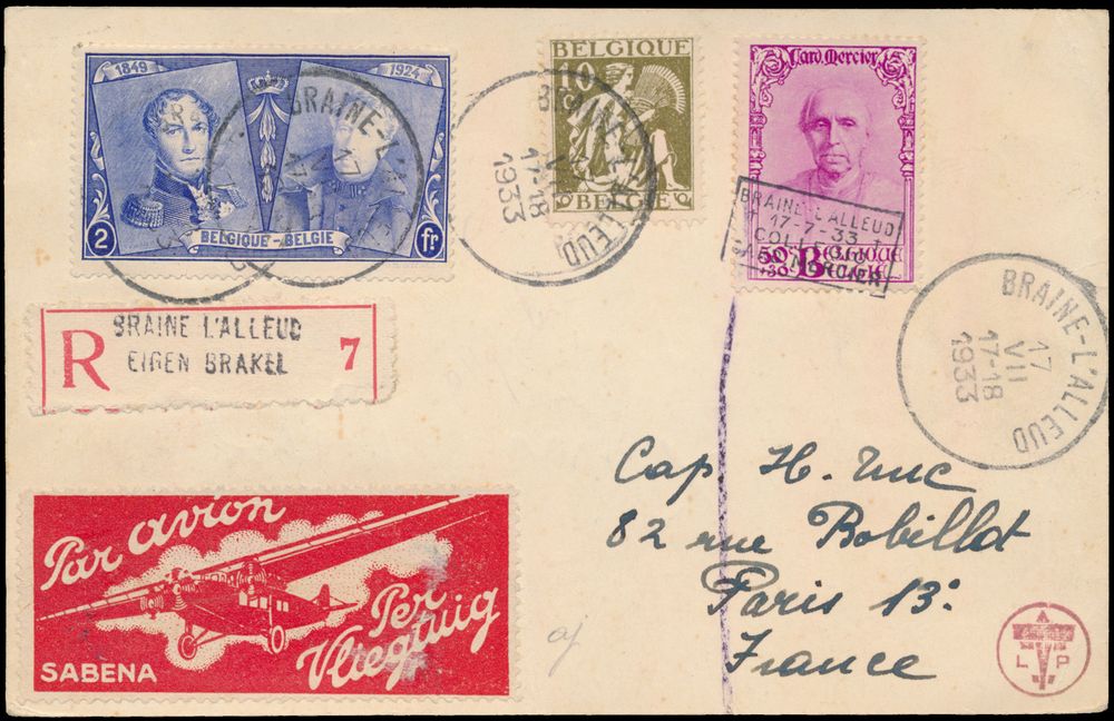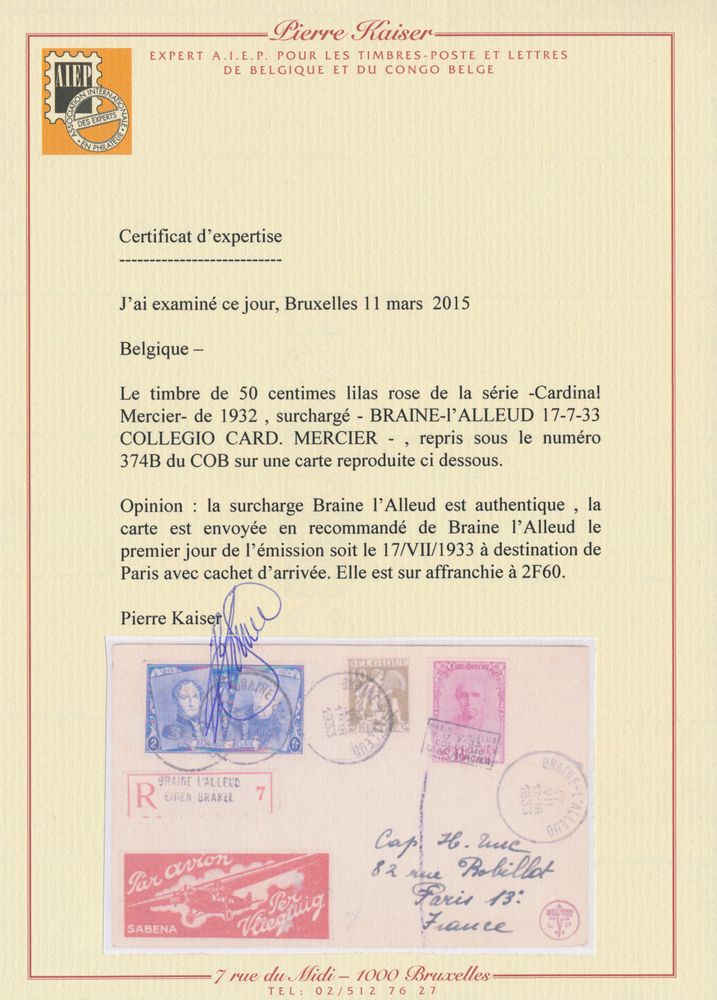 1870 image1933, n° 374B "50c. + 30c. lilac-pink" + 231 and 337 on overfranked registered card with Sabena vignette from Braine L'Alleud 17-VII-1933 (1st day) to Paris, Kaiser photo certificate, vf(Image 1) (Image 2)