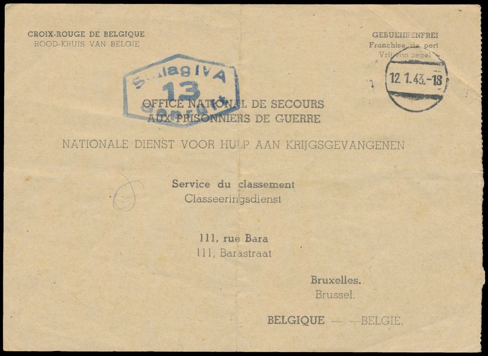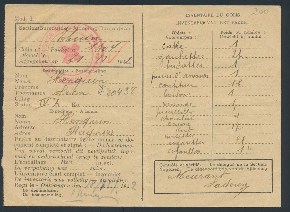 1897 image1942 Red Cross document, from Thuin, dated 21.11.1942, arrived on 12.1.43, National Service for Assistance to Prisoners of War, with blue cancellation "Stalag IVA 13 Geprüft", with a list of goods sent, vf(Image 1) (Image 2)