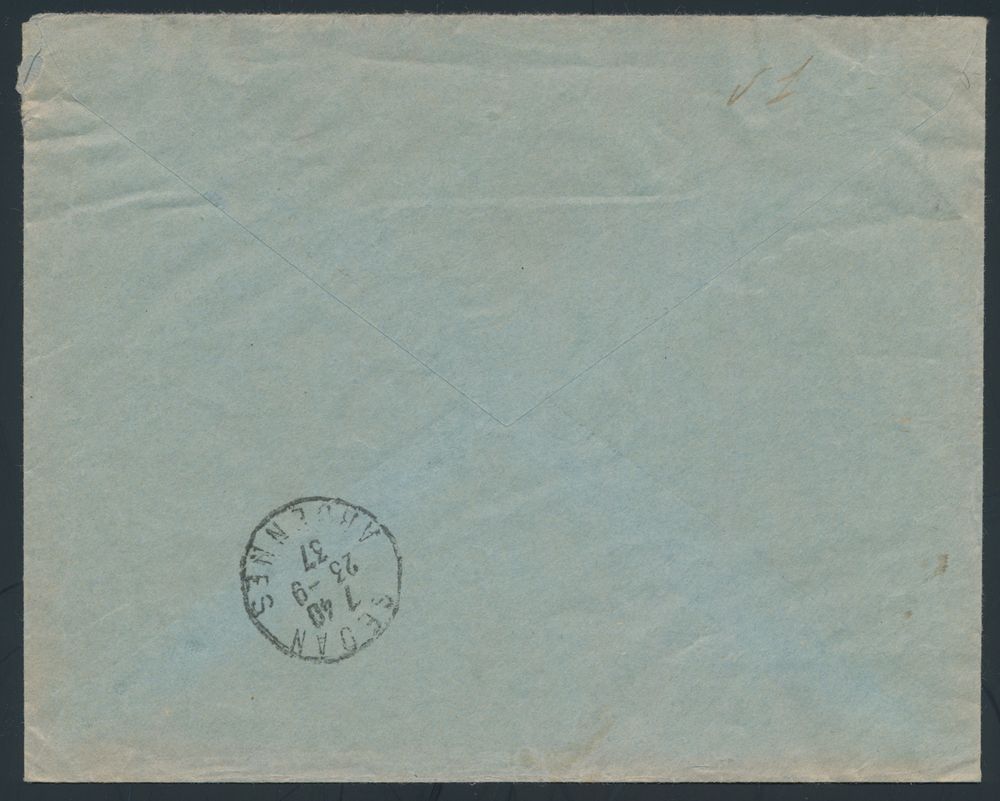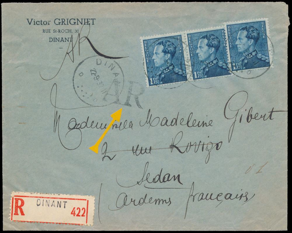 1885 image1937 N° 430, 3 times on registered cover, from Dinant, dated 22 9 37, to Sedan (Ardennes Français), with "AR" (Avis Réception) manuscript and handstamp, charge: first weight class "1.75fr.", registration fee "1.75fr." and receipt fee "1.75fr." (total postage "5.25fr."), vf(Image 1) (Image 2)
