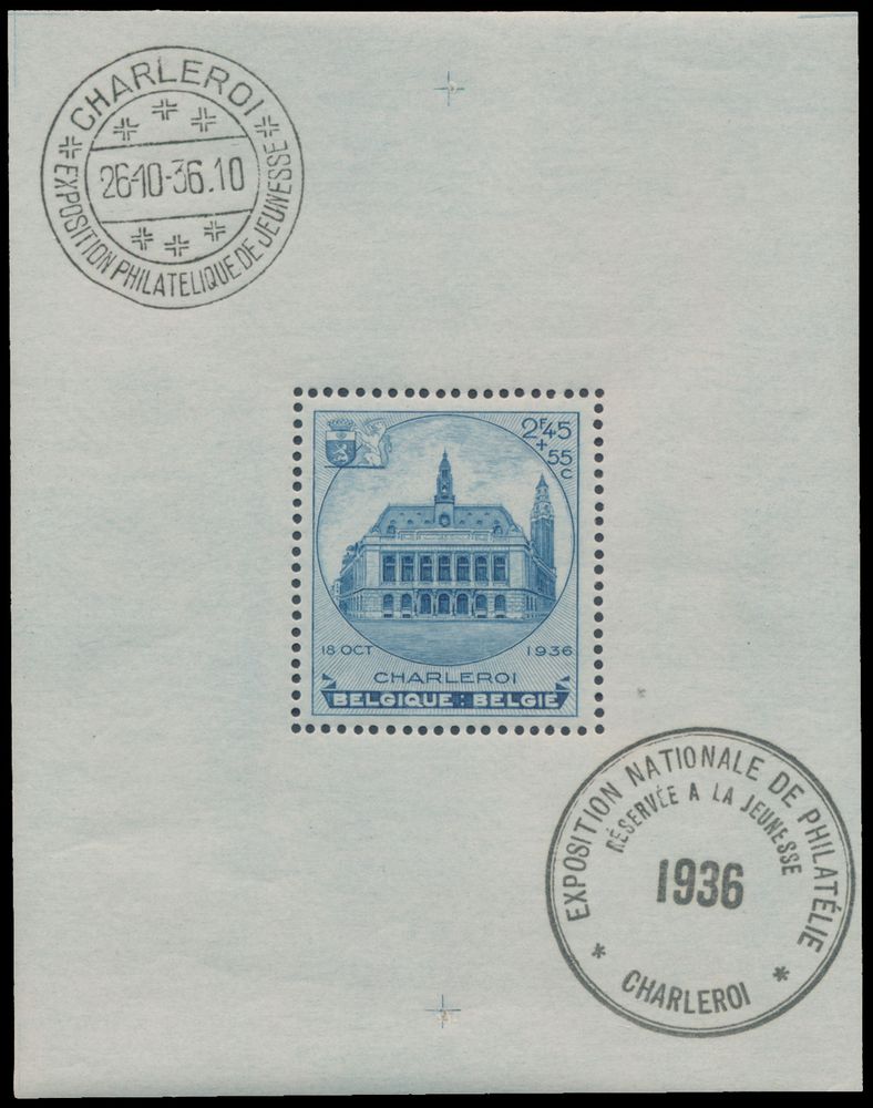 1888 nh imageBL 6 "Charleroi", souvenir sheet with 2 cancellations in margin, 1 of which is "Exposition Nationale de Philatelie 1936, Réservé à la jeunesse", vf (OBP €190)(Image 1)
