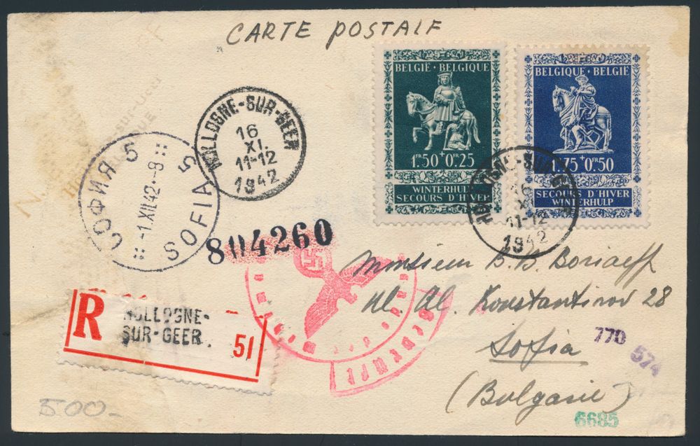 1898 image1942 N° 608/609 "Sint-Maarten III" on registered letter from Hollogne-sur-Geer, 16.XI.1942 to Sofia (Bulgaria), with German censorship mark, f(Image 1) (Image 2)