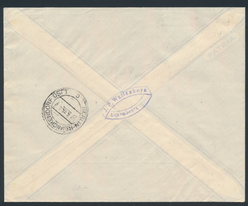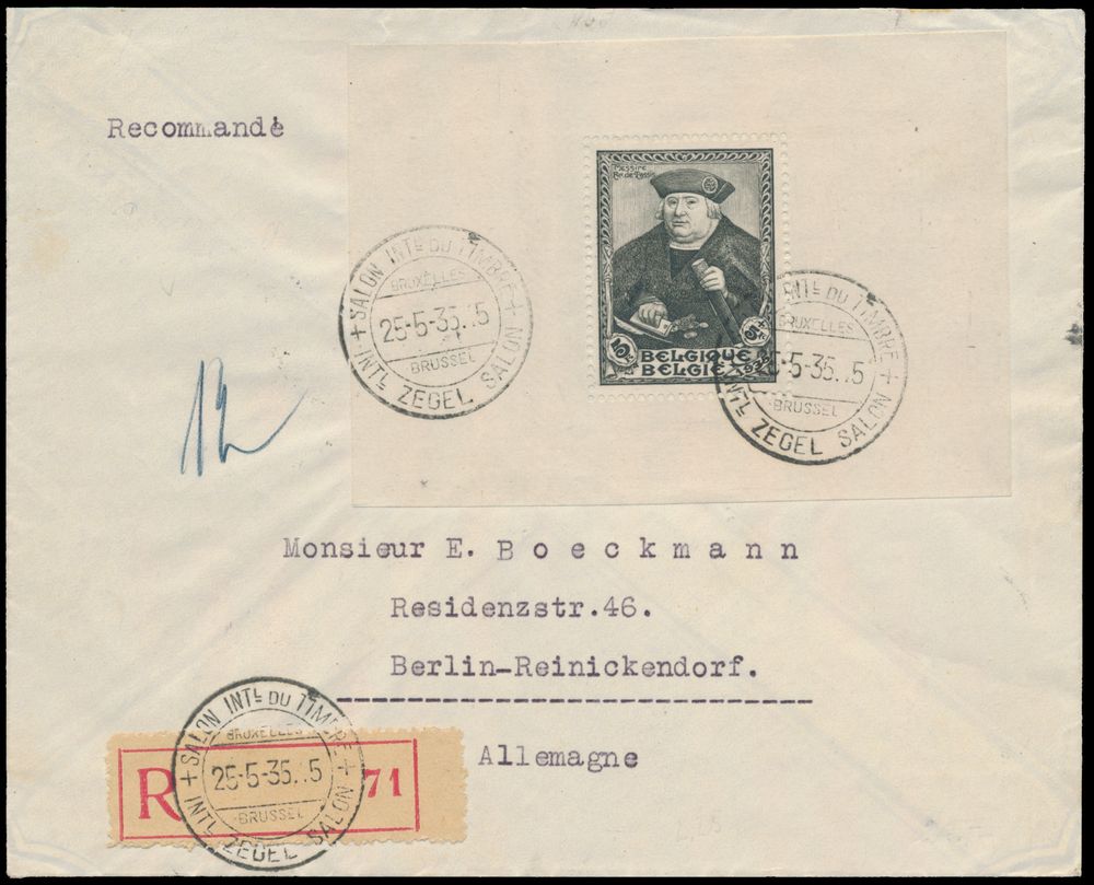 1881 image1935 N° 410 "Stamp from souvenir sheet" on registered letter from Brussels Salon cancellation 25-5-1935 to Belgium, vf(Image 1) (Image 2)