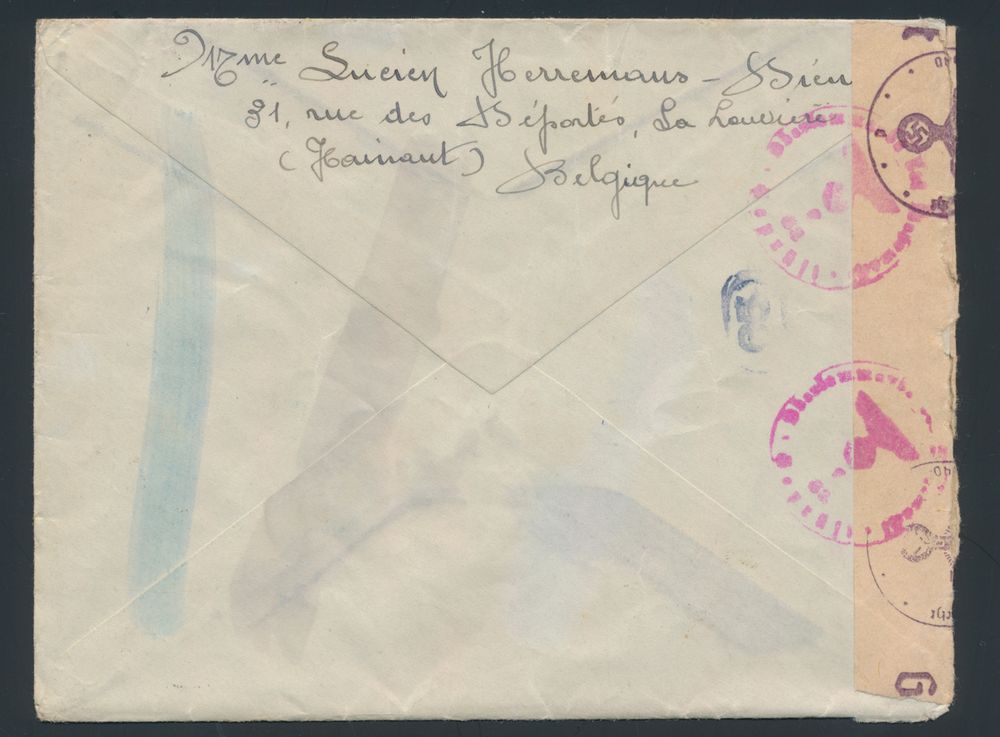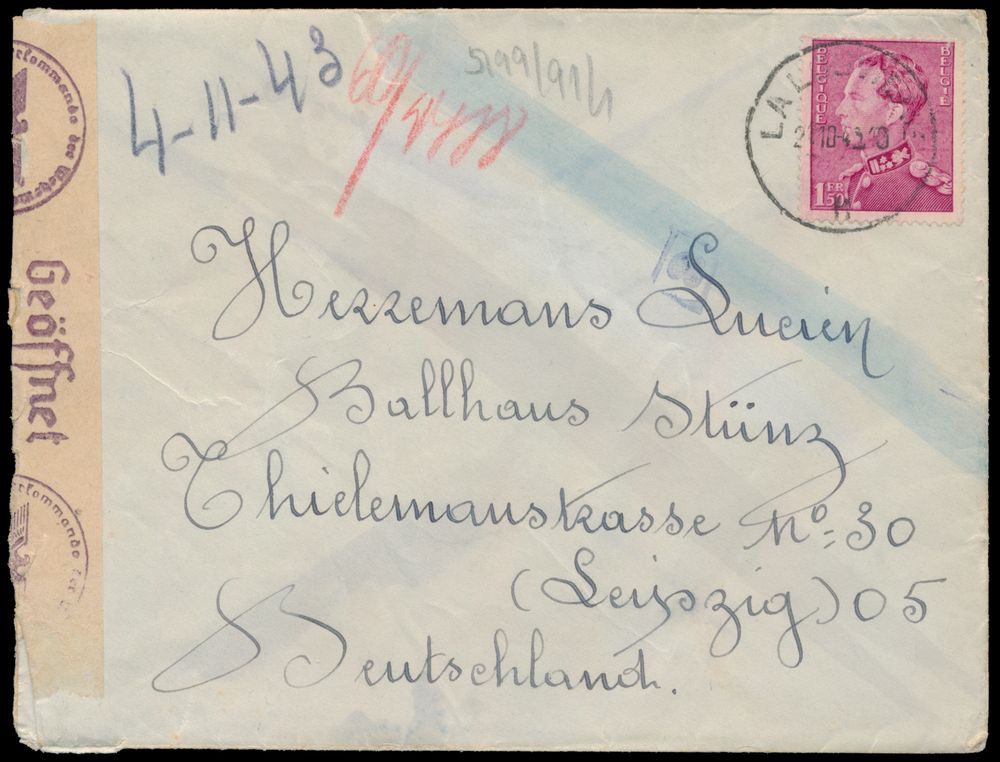 1899 image1943 N° 429 "1.50fr. rozelila", on from La Louvière, dated 21-10-43, to Leipzig (Germany), with censorship label and mention of 4-11-43, vf(Image 1) (Image 2)