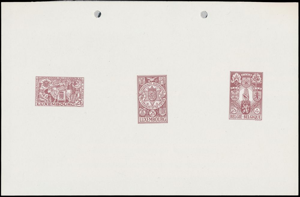 1980 imageExpo 58, unadopted design, 1 design in brown on glossy paper "2fr." + "75c." together with two Luxembourg stamps in brown "2fr.", vf(Image 1)