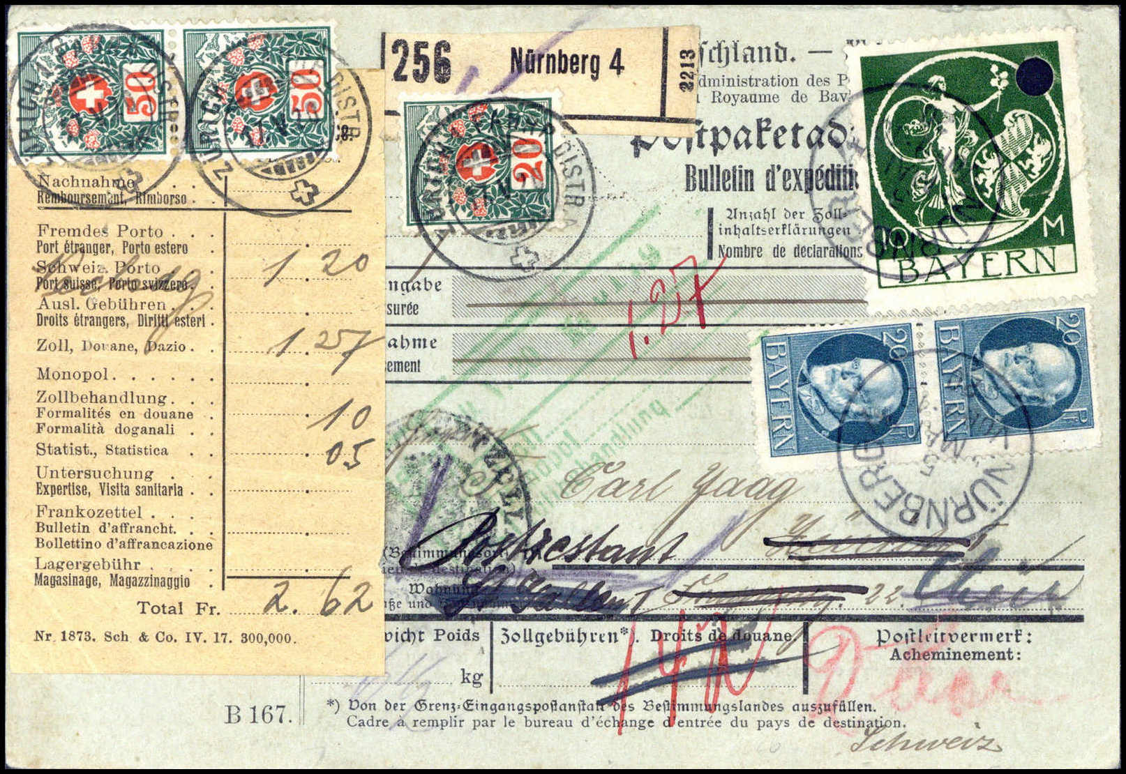 5 und 10 Mk. (beide mit Sicherungslochung) mit Paar 75 Pfg. sowie Ludwig 20 Pfg. vs. und rs. auf kpl. Paketkarte in die Schweiz, dort mit Portomarken 20 und 50 C.(2) nachfrankiert