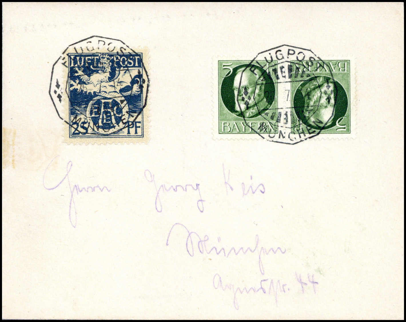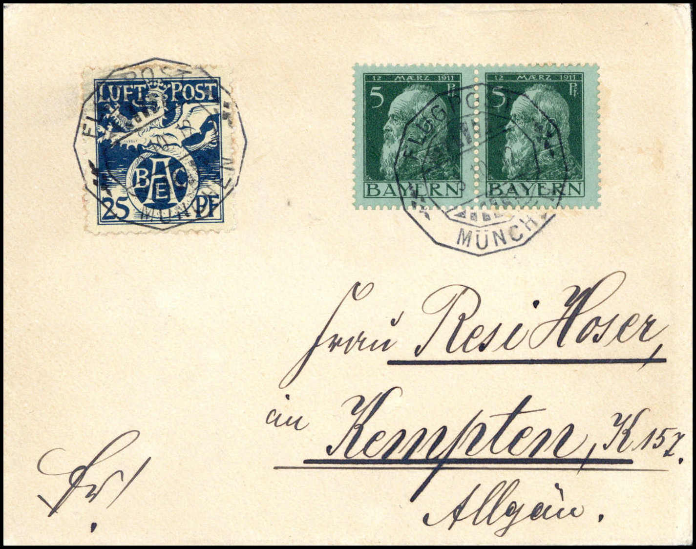 25 Pfg. mit waagr. Paar Luitpold 5 Pfg. auf tadellosem, gel. Brief mit SST FLUGPOST MÜNCHEN nach Kempten