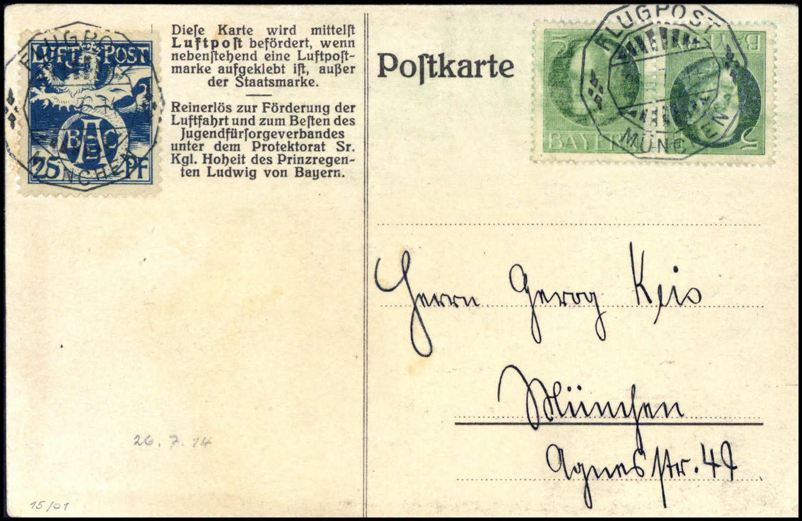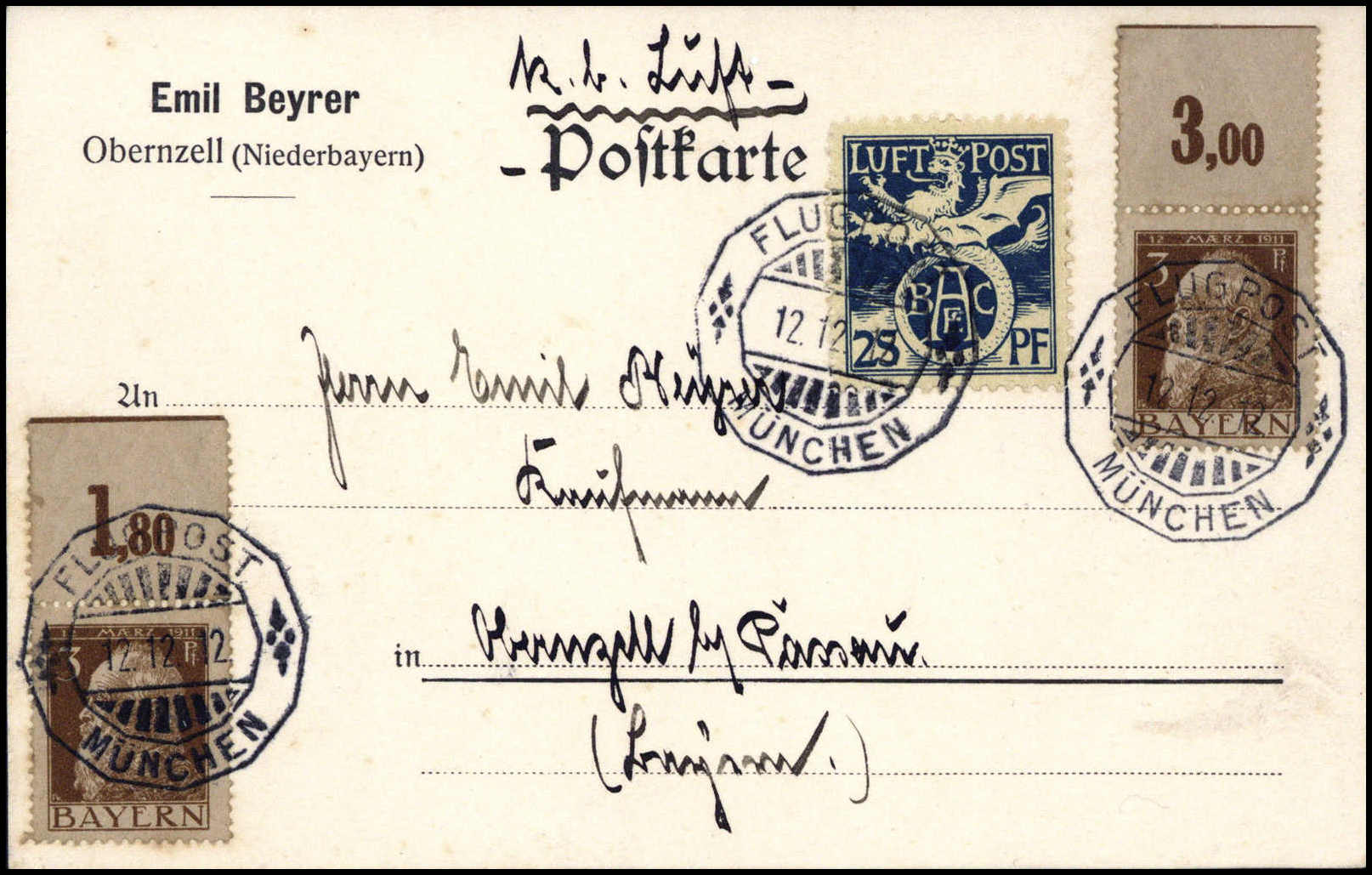 25 Pfg. mit zweimal Luitpold 3 Pfg. auf tadelloser Postkarte mit SST FLUGPOST MÜNCHEN 12.12.12