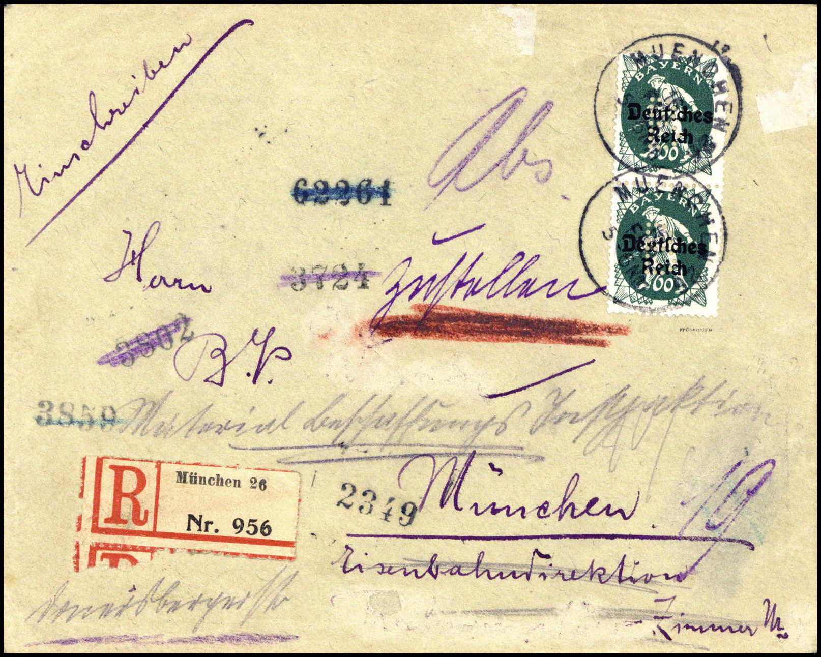 60 Pfg., senkr. Paar als Mehrfachfrankatur auf R-Ortsbrief mit klaren Stempeln MUENCHEN 26 16/2 21. Aufgrund div. Weiterleitungen sind zahlr. Vermerke und Radierspuren vorhanden, sign. Pfenninger. Katalogpreis: 1.100,-