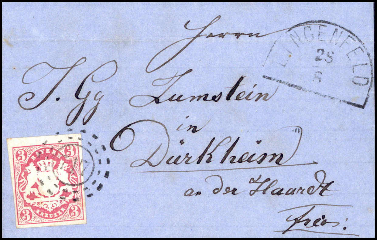 3 Kr., interessanter Umschlag (verklebter Öffnungsfehler) mit HK BAD BRÜCKENAU nach Frankfurt/M. Dort nicht zustellbar und erneut aufgegeben mit violettem Franko-K1 FRANKFURT A./MAIN F. 6/8 69 nach Großkarben. Ein postgeschichtlich