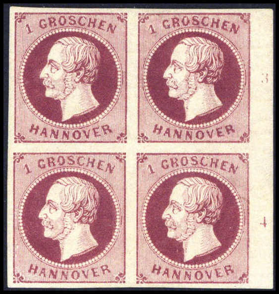 1 Gr. weinrot, feiner Druck, ungebrauchter Viererblock vom re. Bogenrand mit Reihenzahl "3" und "4", Fotoattest Berger BPP. Katalogpreis: 750,-+
