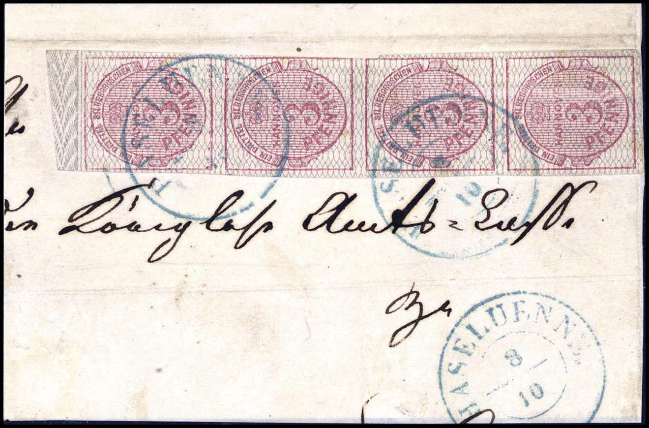 3 Pfg., graues Netzwerk, farbfrischer senkr. Viererstreifen, oben mit Bordüren-Bogenrand (2 Marken etwas berührt) auf Bfstk. mit sauber aufges. blauen K2 HASELUENNE. Eine seltene Einheit. Katalogpreis: 2.200,-+