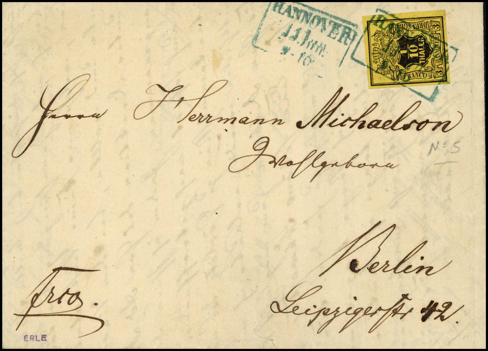 1/10 Th., schöner weißer Luxusbrief mit blauem R2 HANNOVER nach Berlin. Katalogpreis: 150,-+