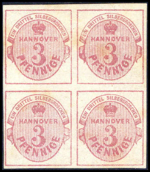 3 Pfg., ungebr. Kabinett-Viererblock, ringsum tadellos geschnitten und mit vollem Originalgummi. Katalogpreis: 500,-