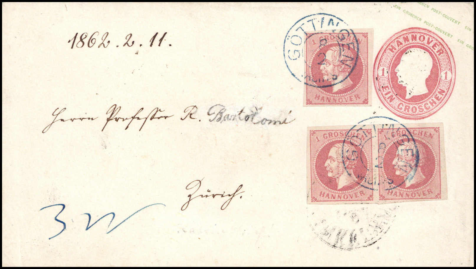 1 Gr., waagr. Paar und Einzelstück auf Ganzsachenumschlag 1 Gr. mit klaren blauen K2 GÖTTINGEN nach Zürich (Name des Adressaten abgeändert)
