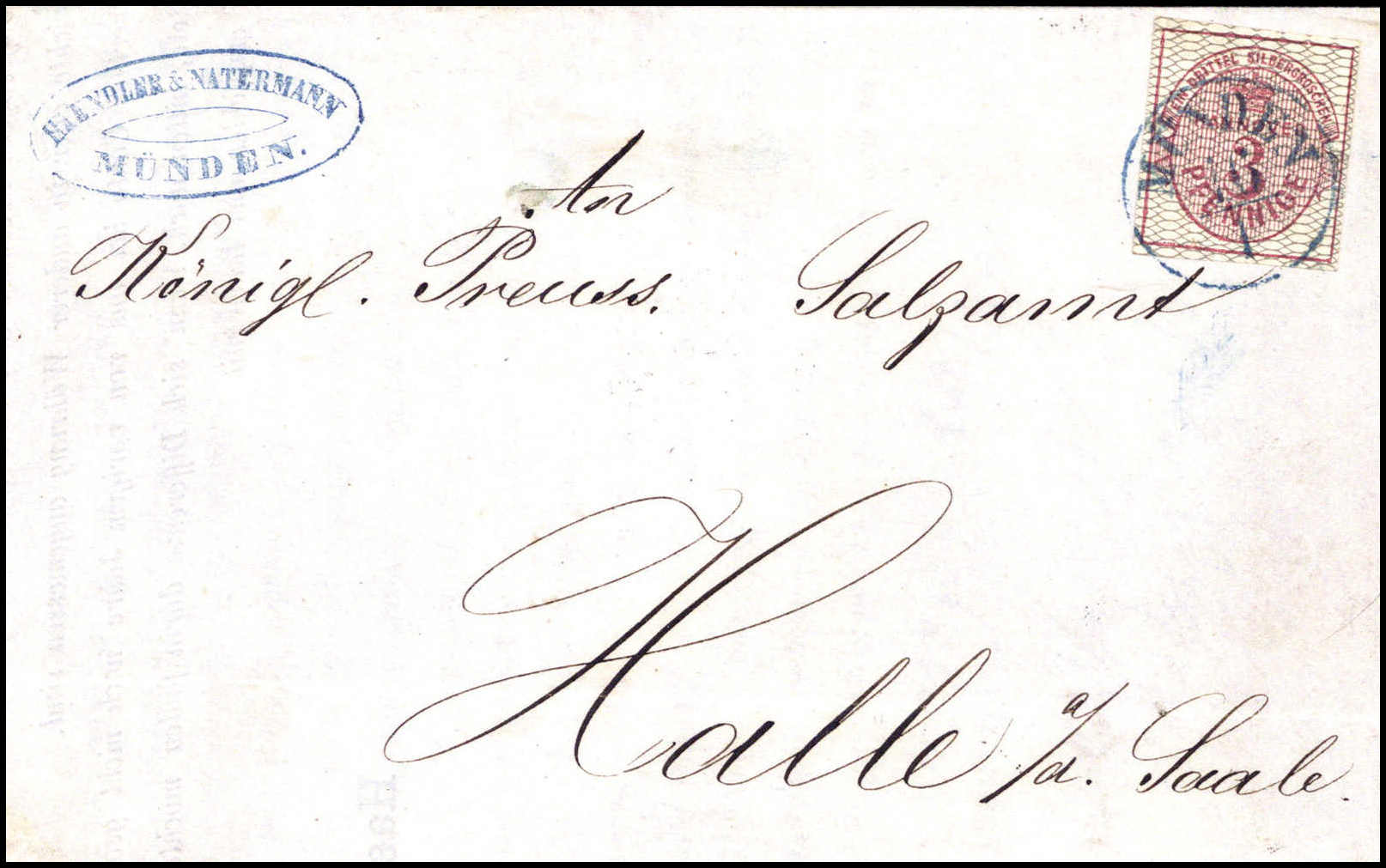 3 Pfg., graues Netz, Luxusstück mit idealem blauem K1 MÜNDEN auf schöner blauer Drucksache nach Halle/S. Katalogpreis: 1.000,-+