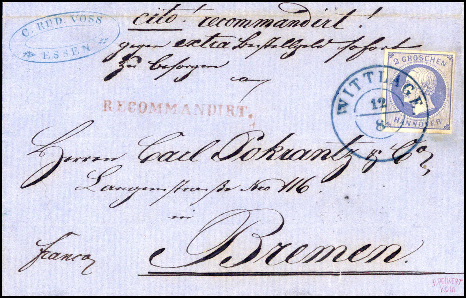 2 Gr. hellblau, schöne Nuance, Luxusstück mit idealem blauem K2 WITTLAGE auf rekommandiertem Faltbrief nach Bremen