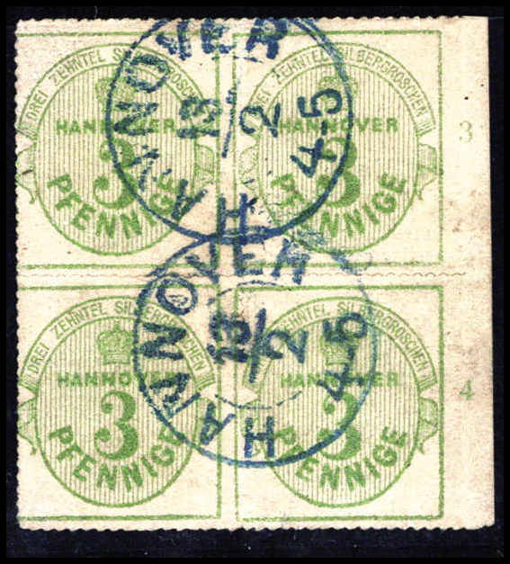 3 Pfg., farbfrischer, gut durchstochener Viererblock (re. unt. Marke kl. Mgl.), re. mit kleinem Bogenrand und Reihenzählern "3" bzw. "4" und zwei sauber aufges. blauen K2 HANNOVER. Eine attraktive und seltene Einheit mit den Randnummern,