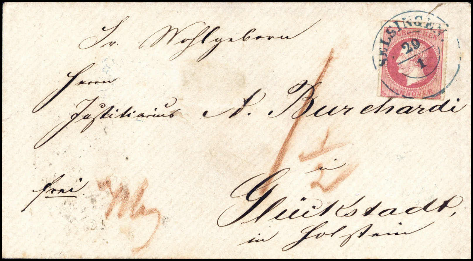 1 Gr., Kabinettstück mit zentr. und klarem K2 SELSINGEN in Blau auf schönem Brief nach Glückstadt/Holstein/Dänemark. Die 1 Gr. deckte lediglich das Inlandsporto, sodaß am Empfangsort 1½ Sch. Nachporto erhoben wurden