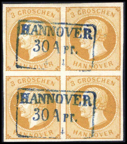 3 Gr., außergewöhnlich schöner und besonders tieffarbiger Viererblock, ringsum vorzüglich breitrandig geschnitten und mit zwei sauber aufges. R3 HANNOVER versehen. Bis auf eine kleine Papierpore und winz. Aufklebefältchen in tadelloser