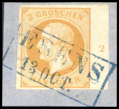 3 Gr., Luxus-Briefstück, re. mit Reihenzahl "2" und schönem blauem R2 ESENS, sign. M.K. Mayer