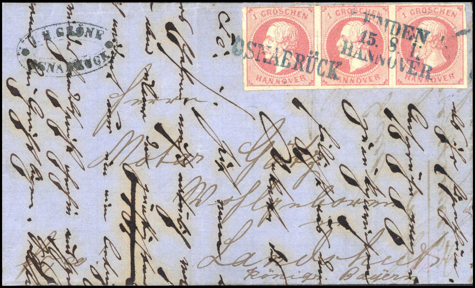 1 Gr. hellrosa, waagr. Dreierstreifen (unten Schere) auf Brief (senkr. überschrieben) mit ungewöhnlicher Entwertung durch blauen L3 EMDEN/HANNOVER auf den beiden re. Marken, die li. mit Stations-L1 OSNABRÜCK