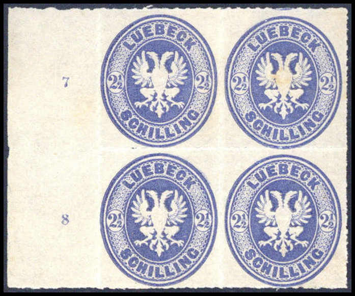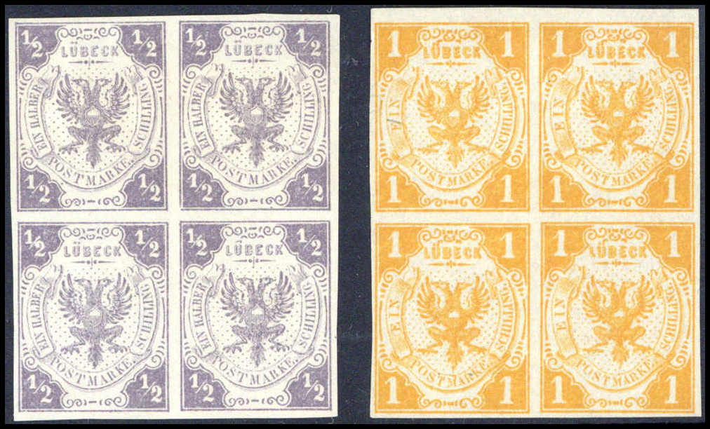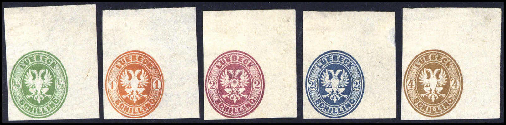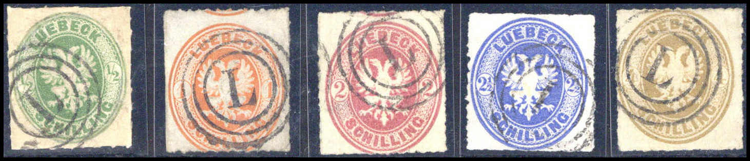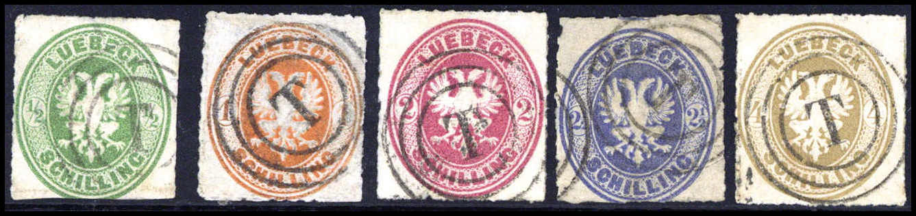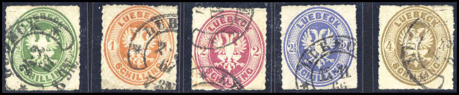 ½-4 Sch., die komplette Serie in vorzüglich farbfrischen Exemplaren (teils winz. Beanstandung), alle mit klarem Hufeisenstempel LÜBECK entwertet. Eine seltene Serie. Katalogpreis: 1.020.-+